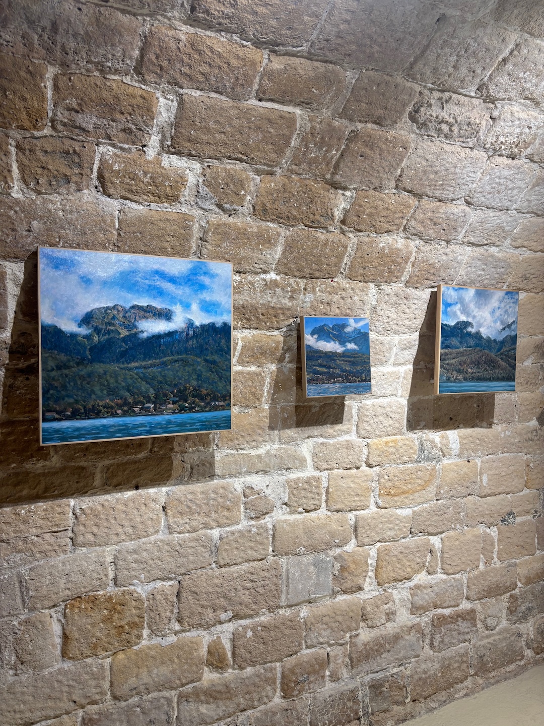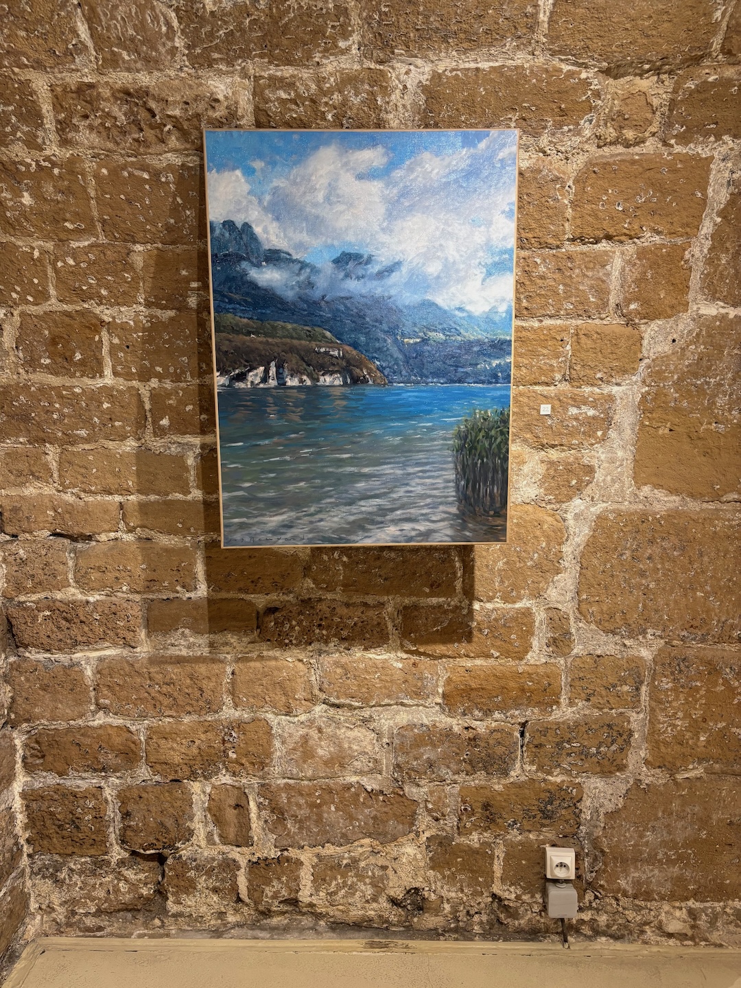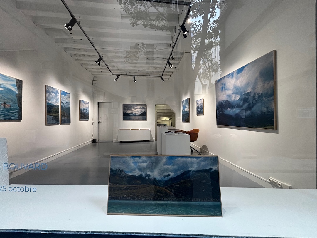 Il aime se fondre dans la nature, s’effacer dans le paysage, suspendre le temps. Jean Daniel Bouvard fait son œuvre en silence, tout en modestie et sensualité. Modelant la lumière, retenant les nuages, il nous donne à entendre le clapotis de l’eau, sentir le léger souffle du vent sur la forêt, celui des gens qui aiment contempler ces lieux, s’y réjouir. Ses toiles sont des respirations, elles apaisent en même temps qu’elles nous aspirent au-delà du cadre. Nous voilà immédiatement ailleurs, au loin sur le lac, par-delà un col, peut-être seul mais jamais triste... car c’est là le secret de Bouvard, il capture la beauté pour la joie et l’élan vital qu’elle réveille. Il ouvre les espaces, élargit nos horizons, nous relie aux forces du monde. Spectateurs immergés, nous nous sentons portés par les énergies du vivant. La montagne et l’eau, éléments fondamentaux du paysage classique chinois, le shanshui, s’entrelacent ici dans un échange intime entre matière, émotion et esprit ; entre l’ombre, la lumière et le doux passage du temps.