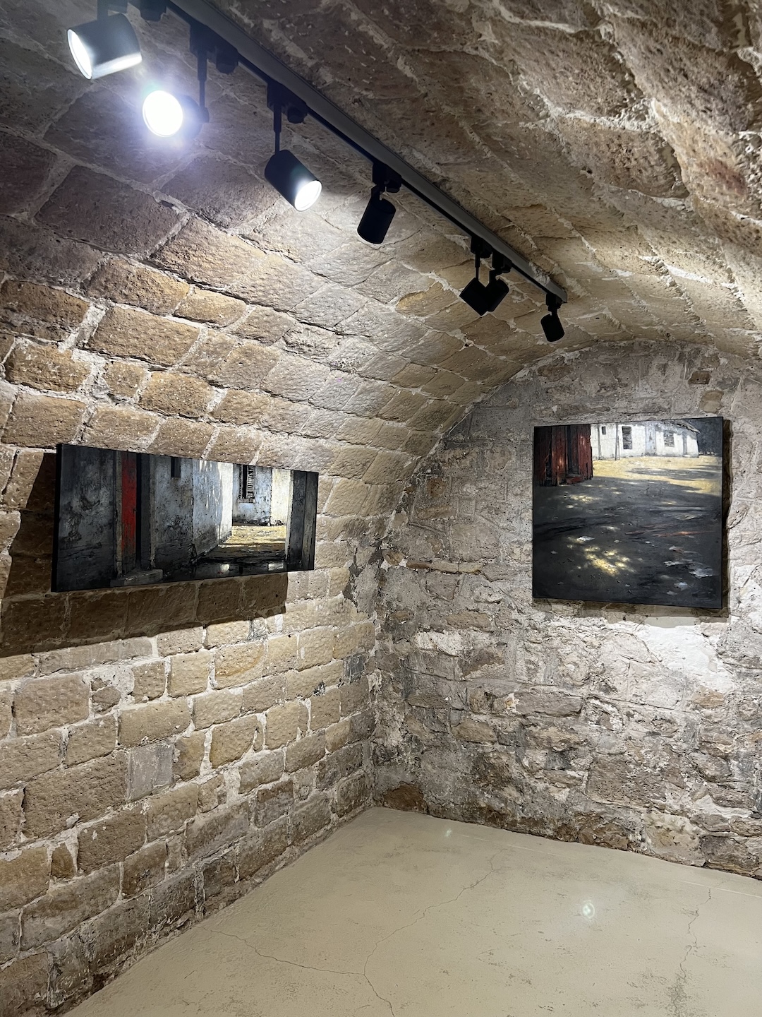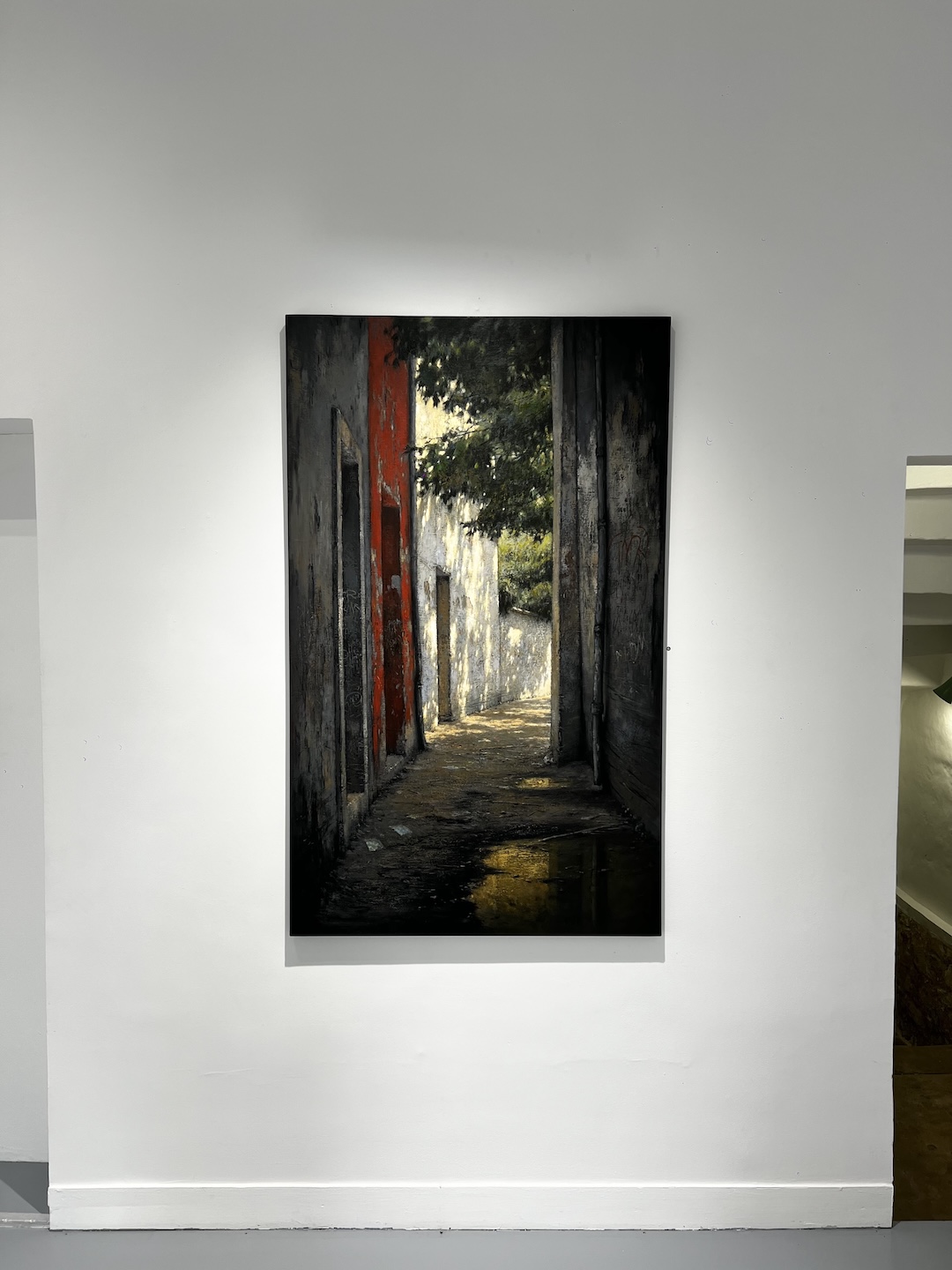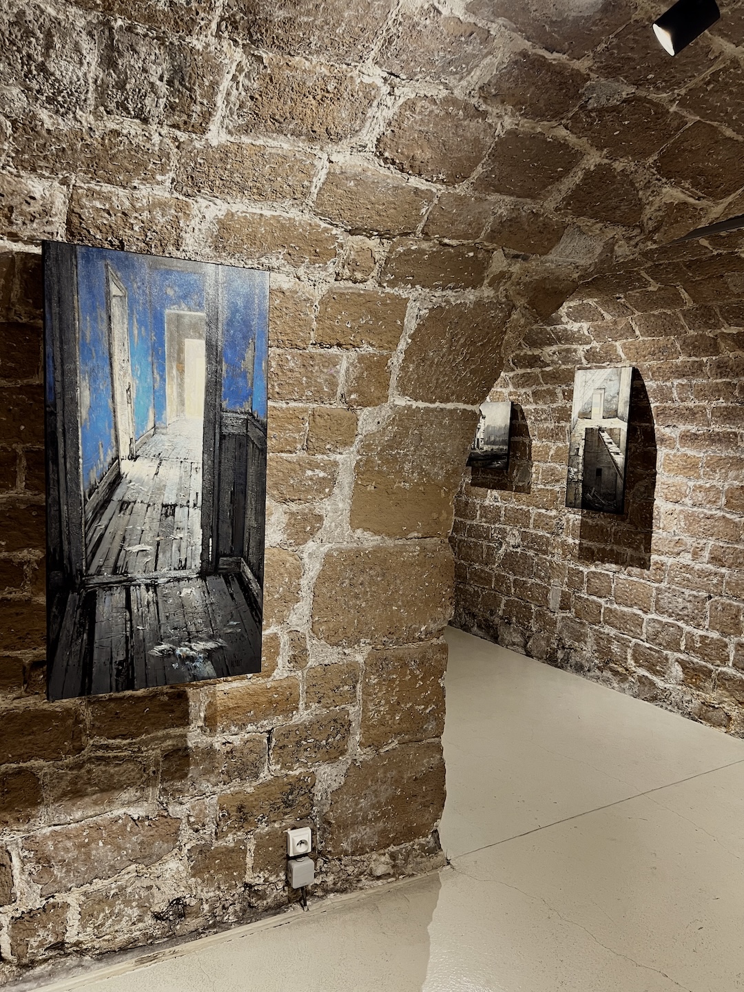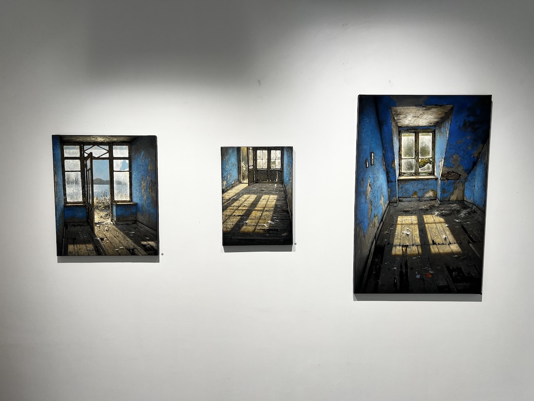 La lumière structure profondément ces compositions. Elle découpe les volumes, glisse sur les murs, s’inscrit au sol en fragments mouvants. Elle crée des tensions entre obscurité et clarté, entre intérieur et extérieur. Parfois, une ouverture laisse apparaître un horizon, comme une échappée ou une projection mentale.
